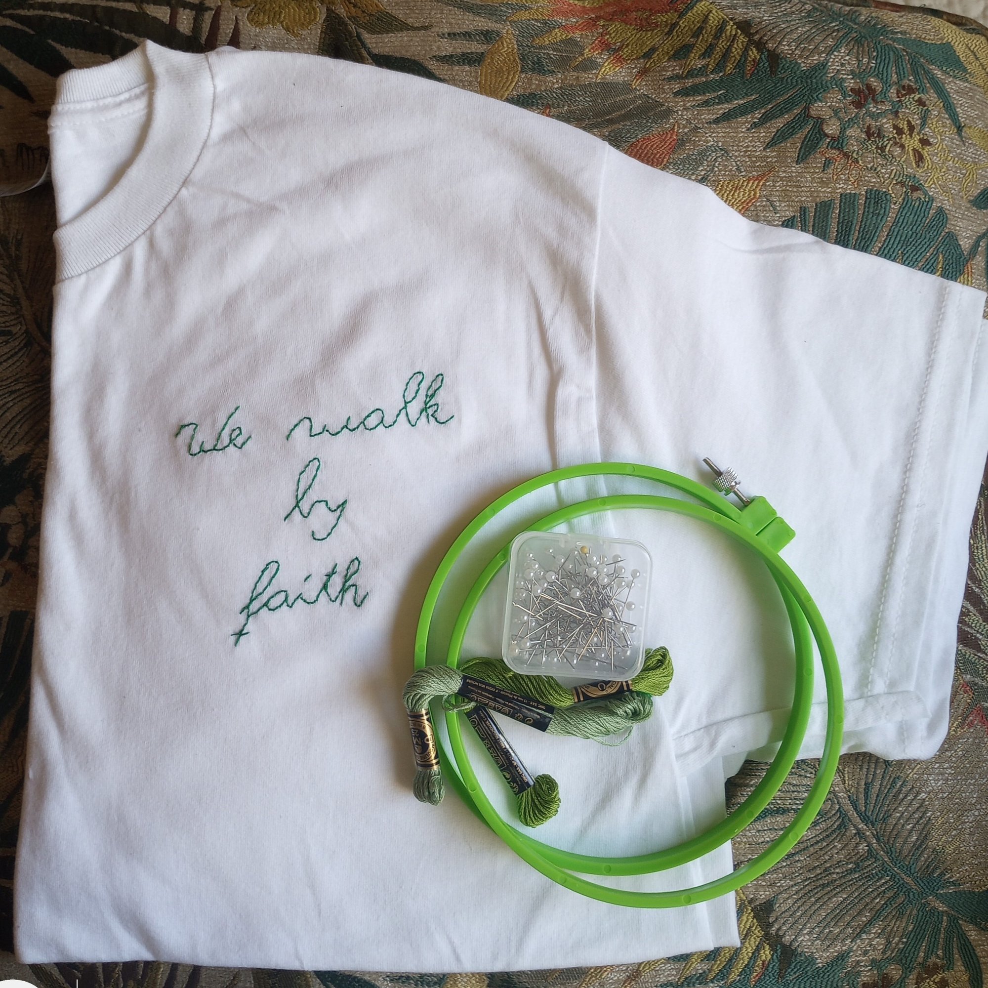 Hand Embroidered 'We Walk by Faith' on white t-shirt.