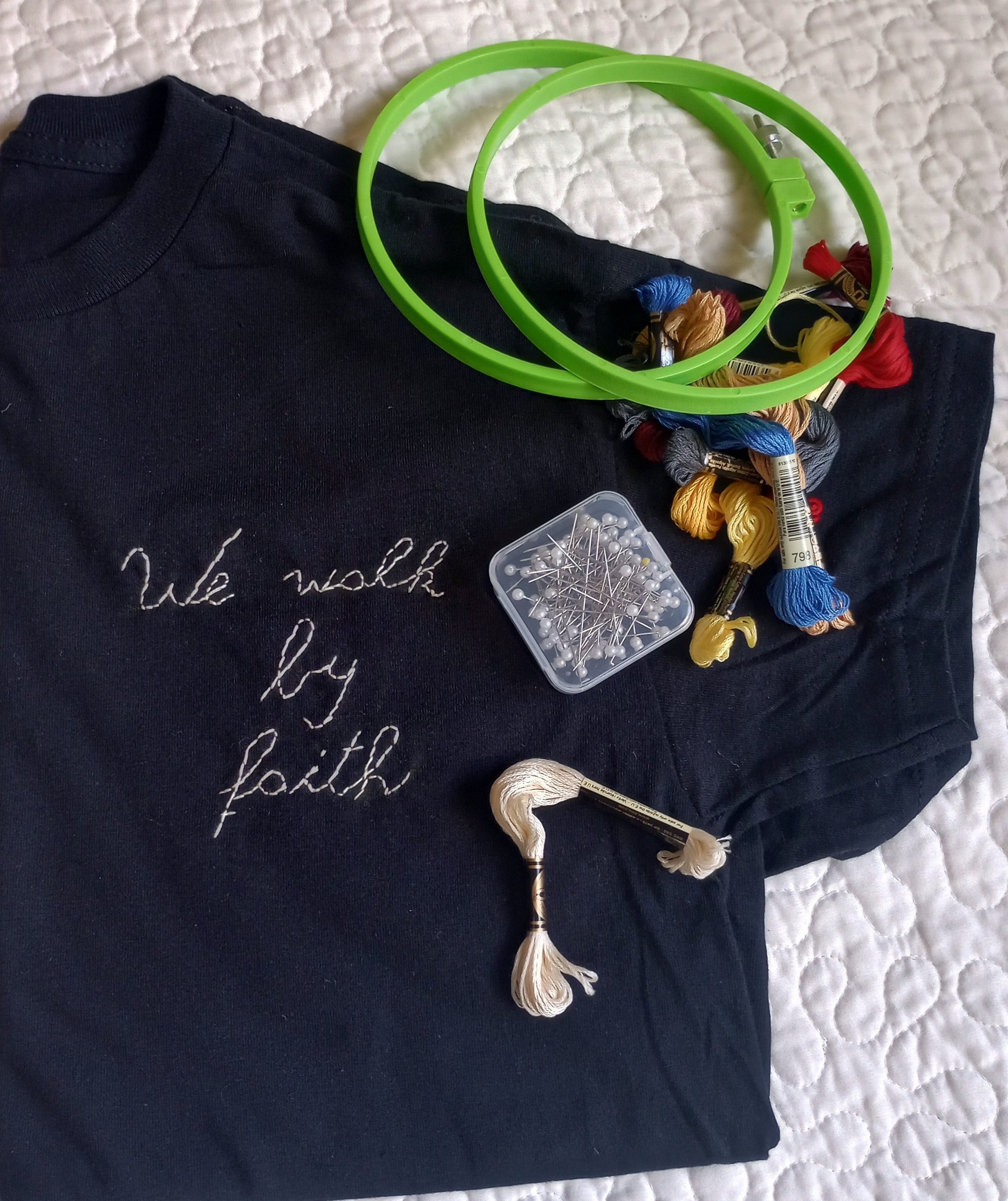 Hand Embroidered 'We Walk by Faith' on black t-shirt.